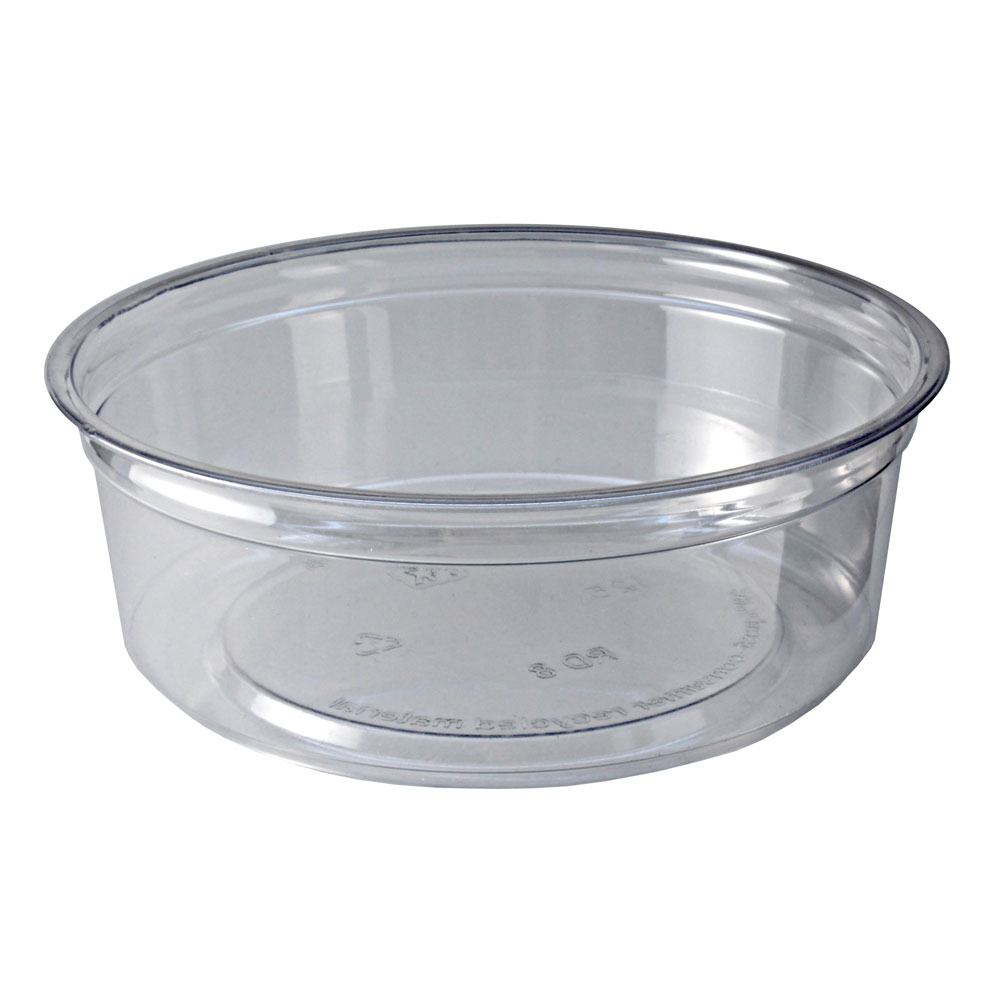 Envase Plástico Deli Redondo de 08 Oz color Pet, Este producto gracias a su alta calidad puede conservar los sabores y olores de los alimentos fríos o a temperatura, el mismo no es apto para uso con alimentos calientes, aceites u otras grasas. Este envase se utiliza con tapa de cierre seguro LRDCLR. Producto viene en cajas de 500 unidades.